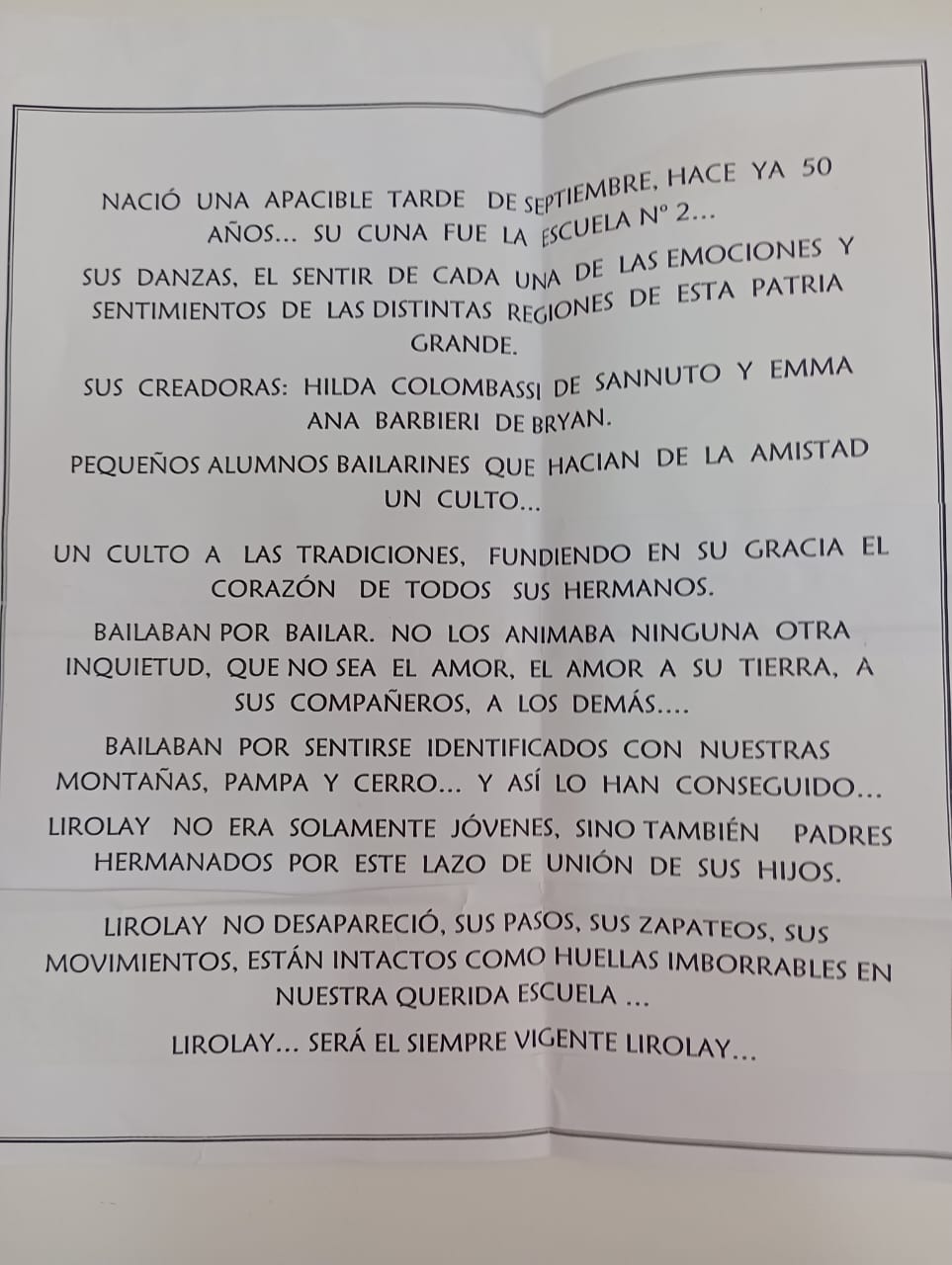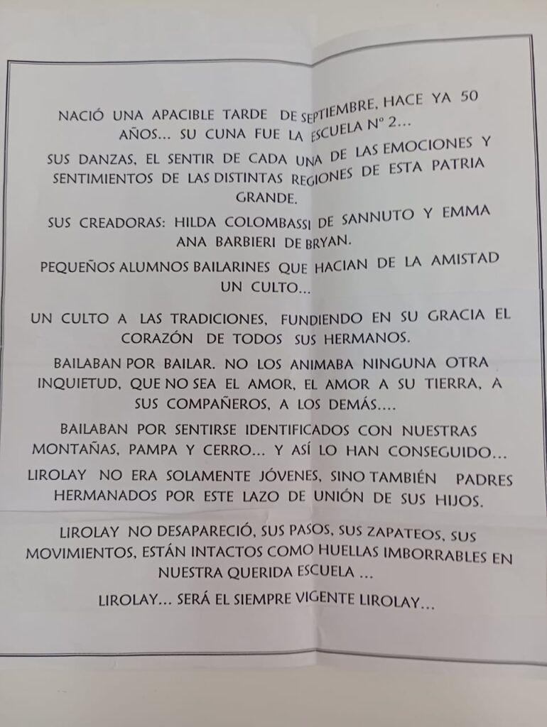 «Lirolay es música hecha danza. Danza nuestra juventud acariciada por los aires de nuestro suelo, monte, cerro y pampa…»
